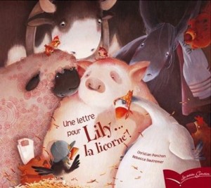 Une lettre pour Lily… la licorne de Christian Ponchon et Rébecca Dautremer. Je crois que ça sera parfait pour Lilie (malgré la faute au nom). Victor le facteur entame ce matin une tournée un peu spéciale : il doit remettre une lettre à Lily la Licorne… Une licorne dans une ferme. Ça ne vous étonne pas, vous ?